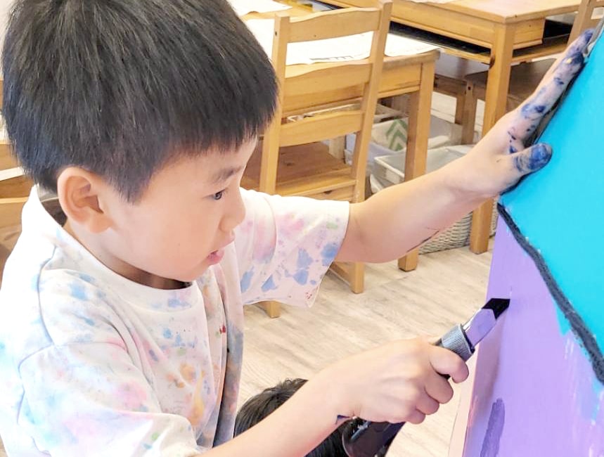 グループ制作も行っています。テーマを決めて、教室のみんなで楽しくお話ししながら1つのものを合同で完成させていきます。お友達の主張を認めながら、自分の意見を発言し他者に認めてもらう。そんな体験をしながら社会性を育てます。