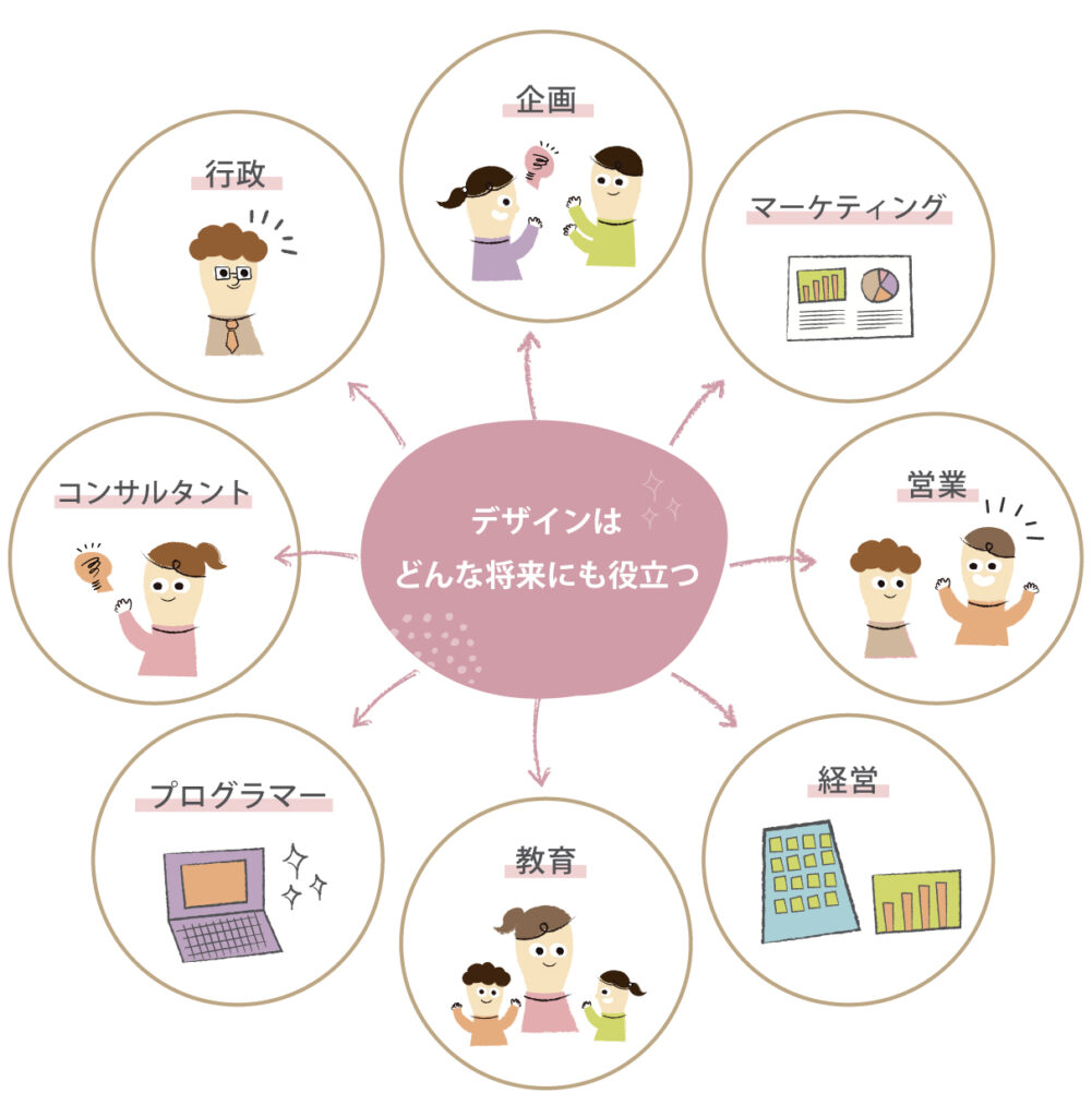 たとえば、商品やサービスを考える 企画やマーケティング職、お客様にわかりやすく価値を伝える 営業職、新しい仕組みをつくる 経営や企画の仕事 においても、デザイン的な発想力と表現力が欠かせません。